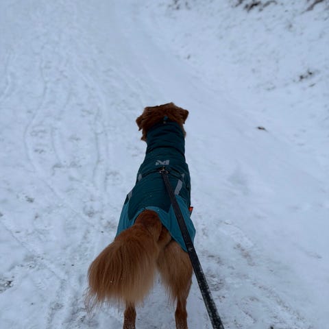Beskyttelsen under magen og delen som festes rundt hunden med klips på ryggen går noe langt bak, så muligens best til hunder med litt bryst eller tispe.