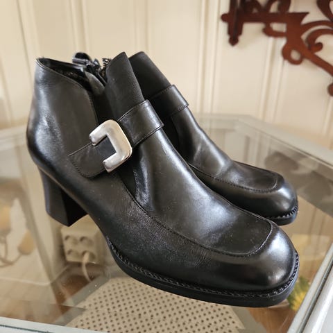 Italienske vintage vinterstøvler med snøring fra Sante Borelli i mørkebrunt skinn til salgs. Ullforing. Str 37,5 men mer som 38. Kjøpt på Enzo Polli i Oslo. Noen bruksmerker som kan ses på bilder, men ellers i bra stand