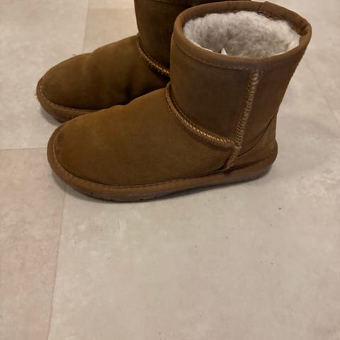«UGG» (ikke ekte, kjøpt på Euro sko eller Skoringen)barnestøvler i størrelse 35. Støvlene har en brun farge og er foret med mykt, isolerende materiale. Egnet for bruk i kaldt vær for å holde føttene varme. Pent brukt.