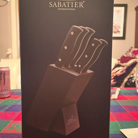 WMF Licorne kjøkkenknivsett bestående av flere kniver med ulike bladtyper. Knivene har sorte håndtak med nagler og er egnet for generell bruk i kjøkkenet.
