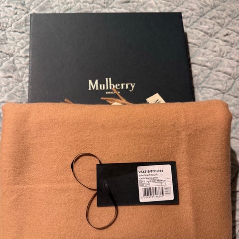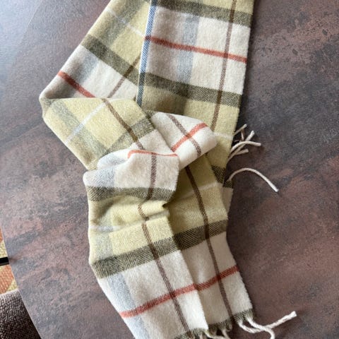 Mulberry skjerf i brun farge, laget av 100% ull (lambswool). Størrelse one size, egnet for kvinner. Skjerfet har et rutemønster og frynser i endene. Produsert i Skottland.
