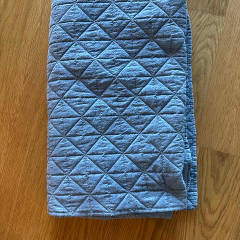 Hvitt sengeteppe med tilhørende pute. Litt fargeforskjell på pute og sengeteppe, pluss noen små merker på sengeteppet.