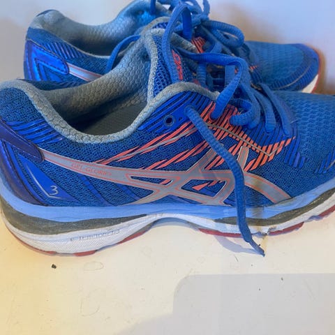 Asics løpesko for dame i størrelse 37. Skoene har en kombinasjon av mesh og syntetiske materialer, med en fargekombinasjon av svart, hvitt og rosa. Designet for løping, med demping og støtte tilpasset denne aktiviteten.