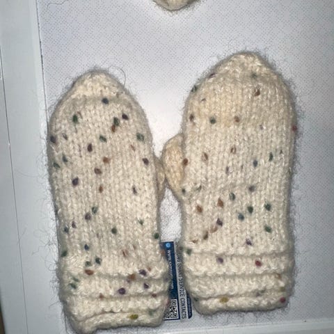 Tovede votter i str ca 5-7 år. Strikket i Rauma vams garn.