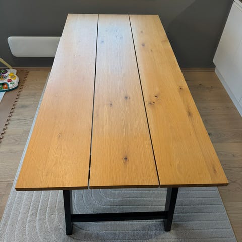 Bordet er pent brukt, men en flis har gått av i hjørnet der bordet trekkes ut. Stabilt og godt. Lengde uten ileggsplate er 220, med: 270