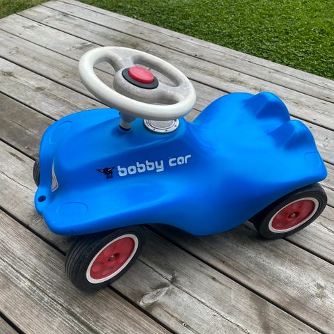 Peppa Gris gåbil for barn i blå og rød farge. Sete har et lite rom under seg. To knapper som lager bla. tutelyd. Blinkelys foran, alt virker. Brukt inne