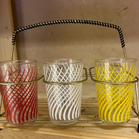 Sett med 6 glass i forskjellige farger med matchende rørepinner, plassert i et svart metallstativ med håndtak. Retro ? Antikk ?