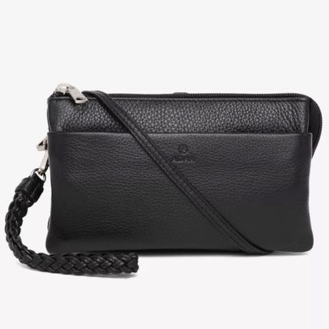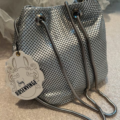Selger en nydelig clutch veske dekket med glitrende steiner. Perfekt til fest, bryllup eller spesielle anledninger. Vesken har metallås og avtagbar lenke, slik at den kan brukes både i hånden og over skulderen.