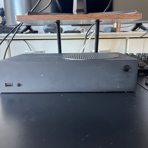 En svart Xbox Series S med utstyr som er headset for den og ladestasjon og batarier til den som du kan lade på ladestasjon og det er 2 batarier og lade plass en kontroller veldig god men jeg liker en gaming bærbar pc bedre