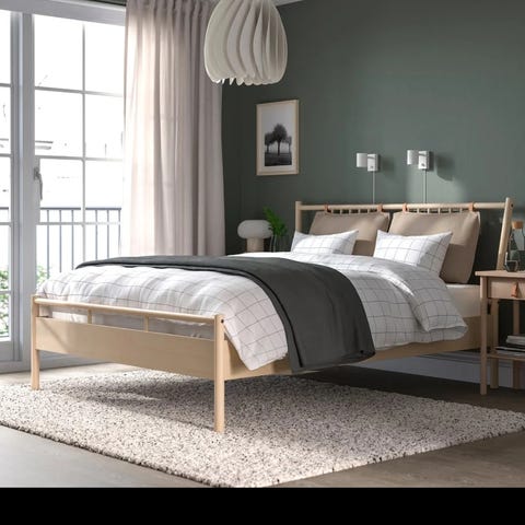 Sengeramme i Eik. Madrassmål 180x200. Skruer som passer til ble desverre borte under flytting. Og en plugg er knekt og må byttes ut. Husker ikke merket på sengen da den ble kjøpt brukt. Tung og stabil.