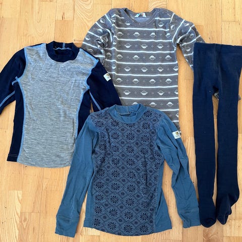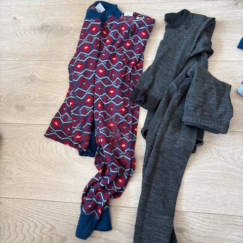 2 sett med 3 overdeler for 75 kr pr. sett. De er synlig brukt, men mye bruk igjen.