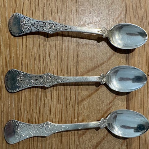 Flat rose, gaffel (kr 1000) og syltetøyskje (kr 800). Begge er 830S.