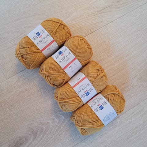 Knit at Home Classic Cotton Merino garn laget av 50 % merinoull og 50 % bomull. Hvert nøste veier 50 gram og har en lengde på ca. 130 meter. Garnet er egnet for strikking og hekling, og fargen er gul.