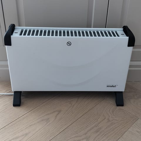 Anslut varmeovn med justerbar termostat og Calor oljeovn med termostatkontroll. Begge enheter er elektriske og egnet for oppvarming av mindre rom.
