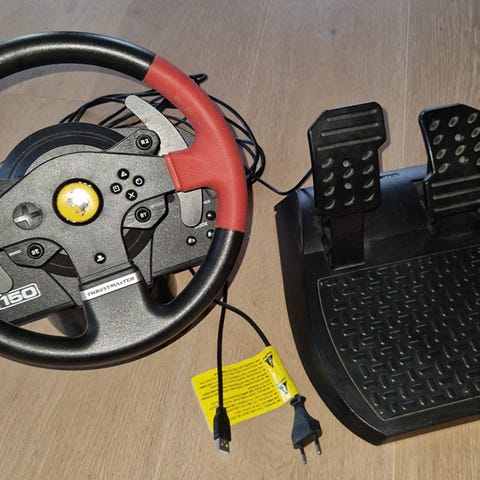Thrustmaster T500RS ratt og pedaler for racing simulering. Inkluderer ratt med kraftig tilbakemelding og tre pedaler for gass, brems og clutch. Designet for realistisk kjøreopplevelse og kompatibel med flere spillplattformer.