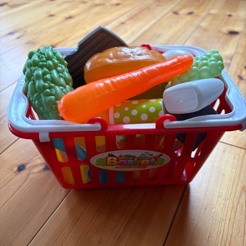 IKEA DUKTIG lekemat og handlekurv for barn med flere plastmatvarer i ulike farger, handlevogn med håndtak og hjul, samt kasseapparat med skuff og lekepenger (både de som tilhører og monopolpenger). Passer ypperlig for barn som ønsker å leke butikk eller vil lage mat. Alt fungerer