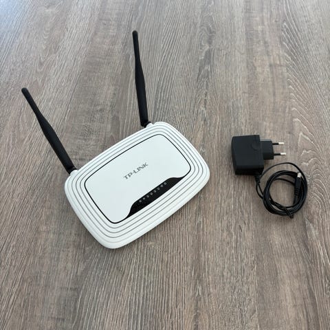 TP-Link MR400 4G Router med 3/4 Ethernet-porter og ekstern strømforsyning. Enheten er svart og beregnet for trådløs nettverksbruk.