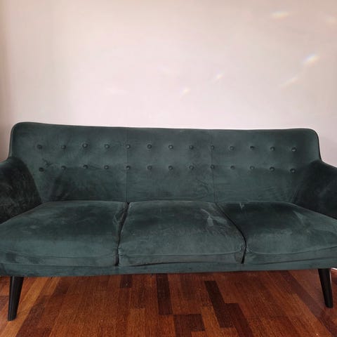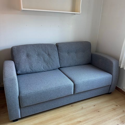 Sofaen har vært i bruk i tre år, men er fortsatt i pen stand. Materialet fremstår velholdt. Passer godt til oppholdsrom eller stue og er svært funksjonell.