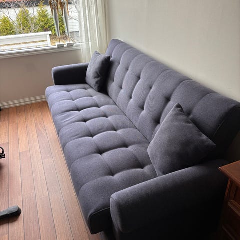 Svart sovesofa med treben og tuftet design