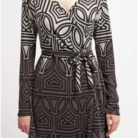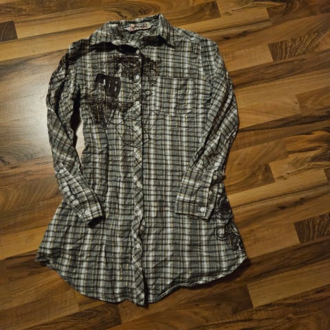Smash kjole i størrelse S, laget av bomull. Kjolen har svart og grå farge og er designet for kvinner. Dyp utringning, kult mønster. Minikjole.
