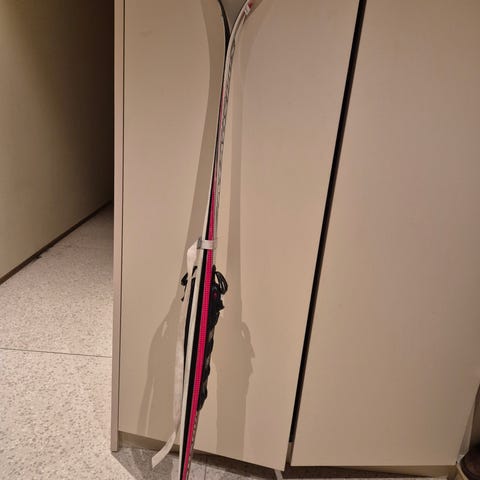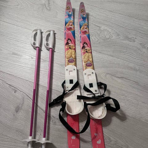 Barneski med staver i blå farge, staver lengde 60 cm. Passer for barn, egnet for bruk på snø. Inkluderer bindinger og staver med håndtak.