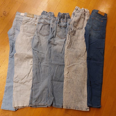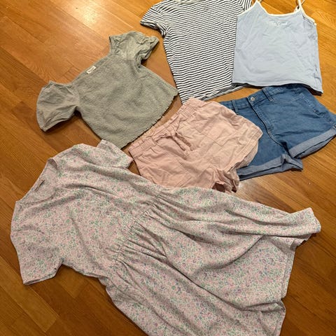 8 plagg: 2 topper, 1 genser og 1 bukse fra H&M, 1 bukse fra KappAhl, 1 genser fra Cubus og 2 bukser fra Lindex