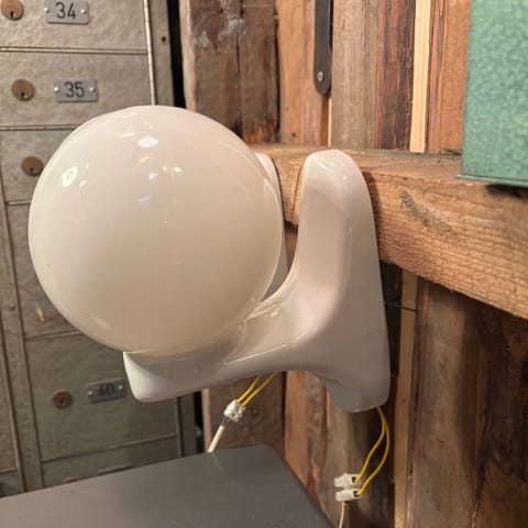 Søkeord: porselenslampe, veggarmatur, industrilampe, vintage lampe, baderomslampe, retro belysning, opalglass, porselen, industriell stil, vegglampe, 50-talls lampe