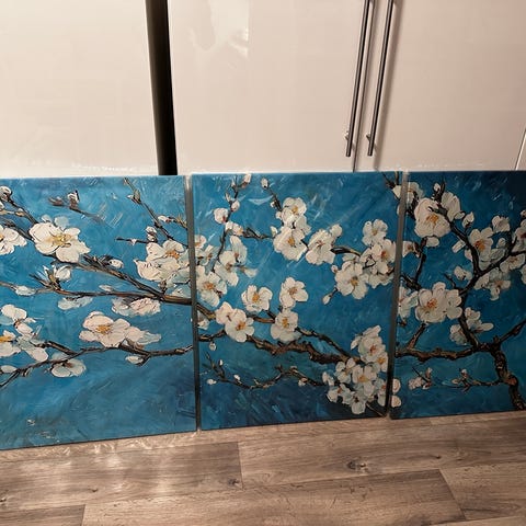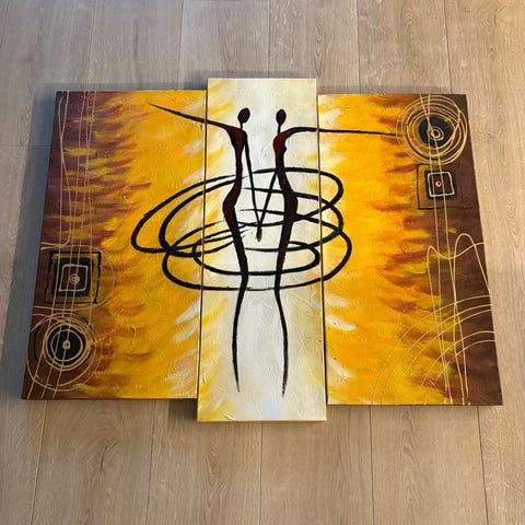 Abstrakt maleri veggkunst med et fargerikt og geometrisk design. Passer til dekorasjon i stue eller andre rom som ønsker et moderne uttrykk.