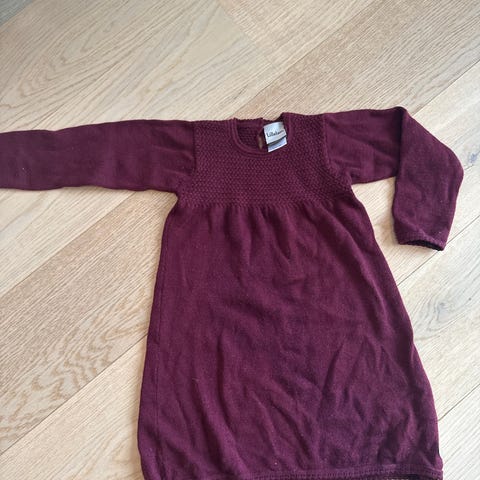 Lillelam ullkjole i størrelse 104, designet for jenter. Kjolen er laget av ull og har en grå farge. Den har kort erme og knappelukking bak nakken.