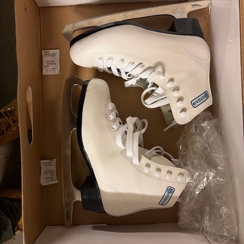 Kunstløpsskøyter uten jern. Ny pris 3995.- . Brukt av konkurranseløper 1 sesong, De egner seg for skøyteløpere som som ønsker et par stivere skøyter enn butikkene tilbyr. Gir bedre skøyteglede. Disse har en slitasje i stoffet som kan repareres, eller brukes som de er.