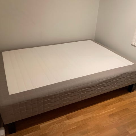 IKEA Skårer lys grå rammemadrass med 10 års garanti og IKEA Näsfjället overmadrass i hvitt.
