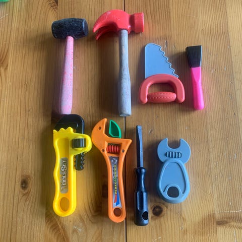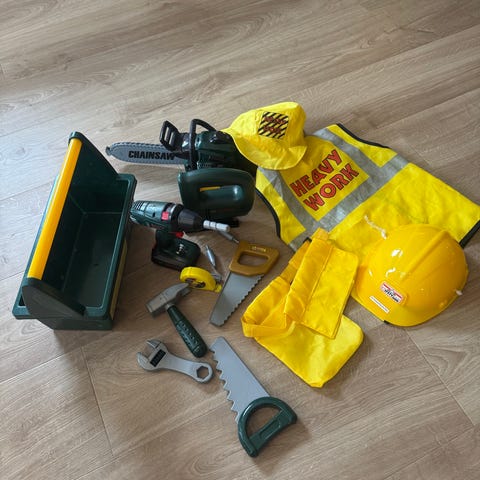 sett med verktøy, hørselsvern, skiftenøkkel og sag som lager lyd!