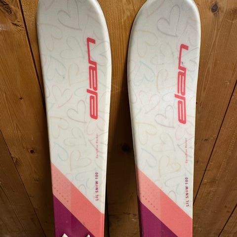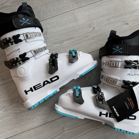 Pent brukt (kun en tidligere bruker) alpinstøvel i størrelse 21-21,5 cm med hvit, svart og gul farge.