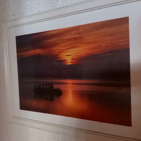 Fotografi som viser en solnedgang med oransje og gylne farger over vann, med en brygge i forgrunnen. Bildet fanger et rolig landskap med fjell i bakgrunnen.