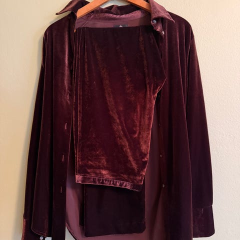 Lilla, ermeløs kjole, i mykt fløyelsaktig.