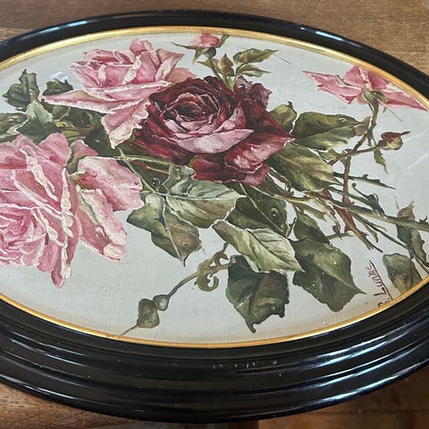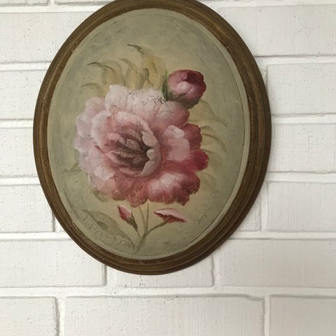 Vintage ovalt speil med malte roser på rammen rundt. Rammen har mørkegrønn farge.