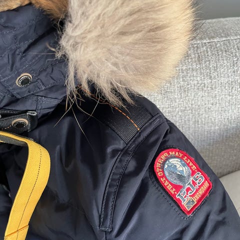 Parajumpers long bear Masterpiece Series annet yttertøy i størrelse S for kvinner. Jakken er marine blå og laget av dun som isolasjonsmateriale. Den har hette med pelskant.