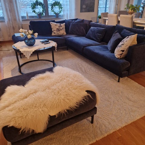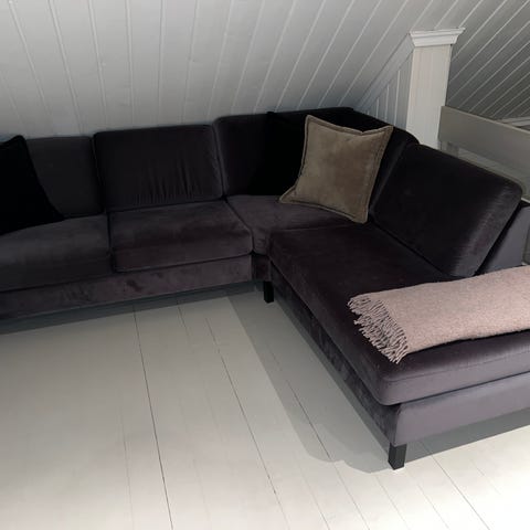Størrelse: Stor og romslig hjørnesofa med god plass til hele familien, samtidig plassbesparende Annet: Ingen flekker eller skader. En av sofaens ben er i tre, men nye ben kan kiøpes om ønskelig Selges billig pga av flytting