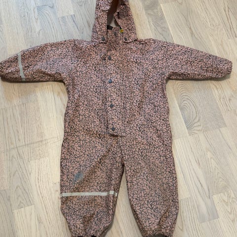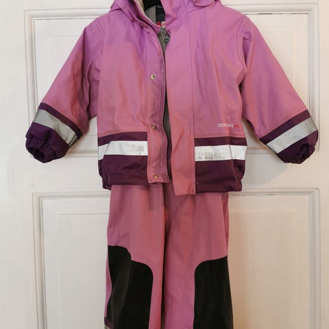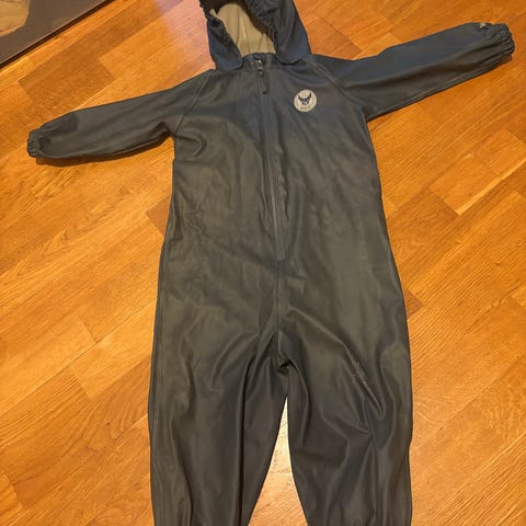 Regntøy fra Helly Hansen i str. 110. Lite brukt, men har fått et par, små lysebrune flekker på innsiden av buksa, se bilde.