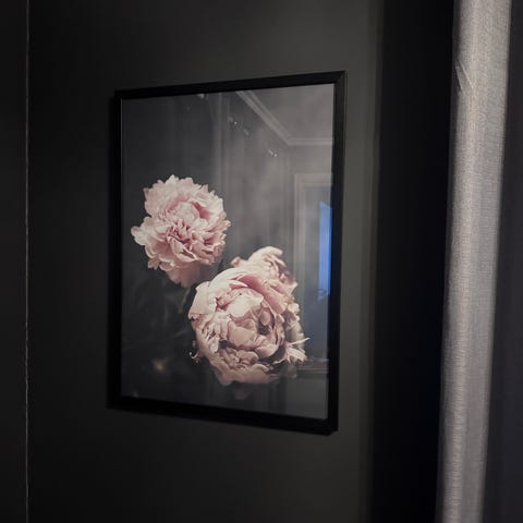 Sort ramme som inneholder tre sort-hvitt bilder med landskapsmotiv. Bildene har ulike naturmotiver med fjell, trær og vann. Passer til veggdekorasjon i hjem eller kontor.