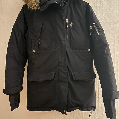 Peak Performance COWEN P vinterjakke for kvinner i størrelse S. Jakken er brun. Designet for bruk i kaldt vær med isolerende egenskaper og hette med sauepels.