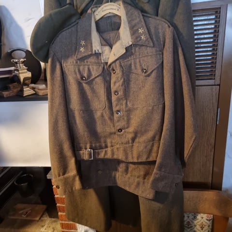 Grand hotel uniform bestående av jakke og bukse. Jakken er rød med svarte mansjetter og gullfargede knapper, samt dekorative detaljer i gull og sort rundt kragen med initialene GH. Buksen er svart med en rød stripe langs siden. Passer til bruk som uniform eller kostyme. Uniformen var den siste klassiske som var i bruk fram til 2003. Hotel Cæsar brukte uniformen som inspirasjon til sine pikkolouniformer. Jeg brukte denne i et år da jeg jobbet der og Bob Dylan holdt døren for meg med den, jeg pakket Michael Stipe sin baggasje etter han havnet på fylla med den, og mistet bagasjen til Blondie med den. Bukse i størrelse 50 og jakke i 54. Mange historier jeg kan fortelle fra den tiden. De øvrige bildene viser meg som bruker den på jobb. Et historisk plagg som burde taes vare på. En liten rift i buksen som enkelt kan repareres. Har lagret den i 24 år, men har ikke plass til den lengre. Selges til høystbydende.