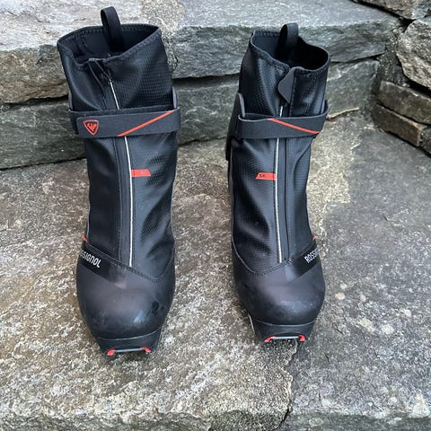 Rossignol skisko i hvit farge med blomstermotiv. Skiskoene har snøring og glidelås på siden for enkel på- og avkledning. størrelse 34