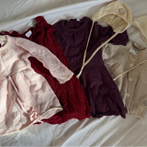 Varme uteklær, lille lam str68 + Cubus og reflex 68-74. Diverse hverdagsklær mest i 74. 1 kjole, 6 bodyer. 5 longs (m føtter, noen nupper) 3 pysjer (en i ull fra Hust & Clair) 2 snekkerbukser, 2 vanlige bukser (myke), 3 gensere, 1 tshorte, 6 bodyer uten armer. 4 sett (bukse og genser) 4 dynetrekk, 2 putetrekk. Perfekt pakke til en jente som plutselig ble litt større ❤️