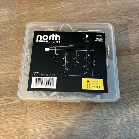 LED lysslynge fra North Light med varmt hvitt lys. Totalt 120 LED lys på transparent kabel som gir et diskret og pent uttrykk når den ikke er tent. Lysslyngen har ca 19 meter lyslengde og 10 meter tilførsel fra støpsel. Kan brukes både innendørs og utendørs og leveres med energieffektiv adapter.