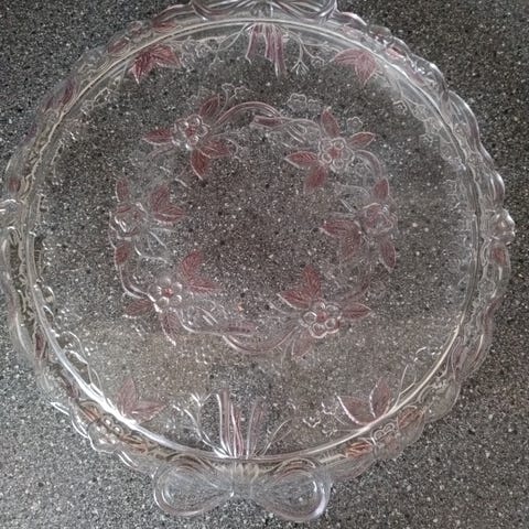 Iittala glass fat med dekorativ blomsterdesign. Fatet har en transparent og rosa farge med detaljer i glass som danner et blomstermønster. Egnet for servering eller som dekorativ gjenstand.