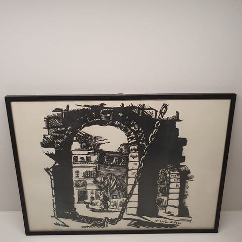 Maleri som viser en brygge med båter og omkringliggende landskap. Bildet har en ramme og bruker dempede farger i blått, brunt og grønt.