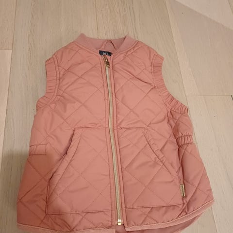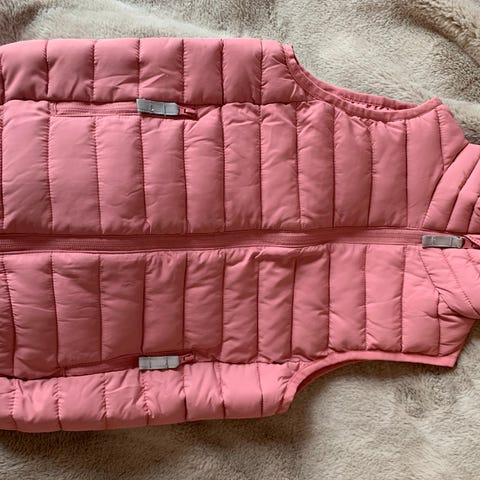 Tøff vattert vest. Rosa med gullfarget glidelås. God å ha på med behagelig ribb og kantebånd. Pent brukt med noen få merker som ikke er sjenerende.