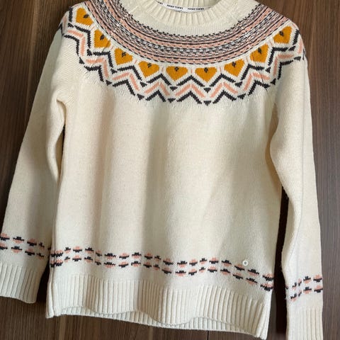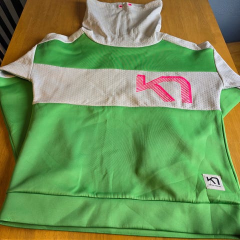 Kari Traa genser i størrelse M for kvinner. Genseren er laget av bomull og har hvit farge. Den har et trykk med fargerike detaljer på fronten.