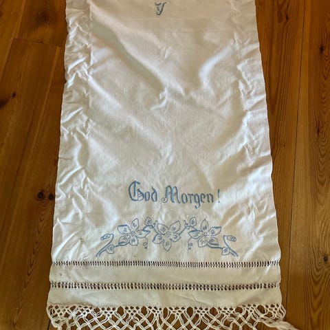 Hjemmelagd pyntehåndkle med aplikasjoner. Det er etter mine oldeforeldre. Det har gått i arv i flere generasjoner. Mine foreldre var født i 1915, så mine oldeforeldre var født på 1800 tallet. Mener st min oldemor døde på 1950 tallet 96 år gammel. Så dette er nok nærmere 150 år gammelt.